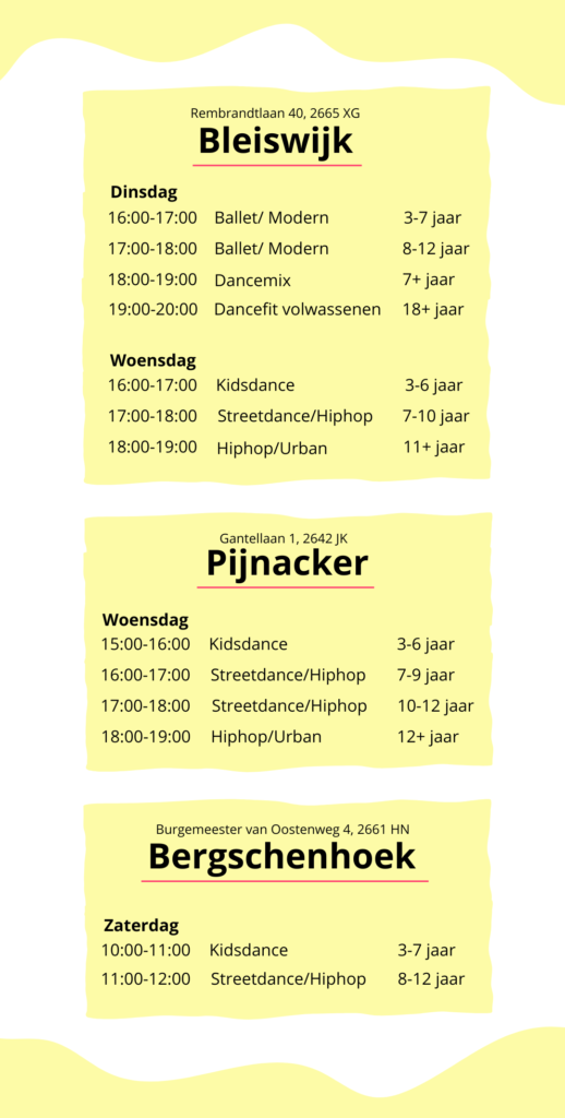 Elke 2 à 3 weken werken we aan een nieuw dansje in een compleet andere stijl, zoals hiphop, jazz, modern, commercial, funk en streetdance. Geen les is hetzelfde! De docent vertelt telkens kort iets over de stijl, zodat de leerlingen niet alleen dansen, maar ook leren waar de bewegingen vandaan komen. De lessen worden gegeven door een ervaren, allround getrainde juf die energie, plezier en uitdaging combineert. Deze les is ideaal om te ontdekken wat je leuk vindt én om zelfverzekerder te worden op de dansvloer.